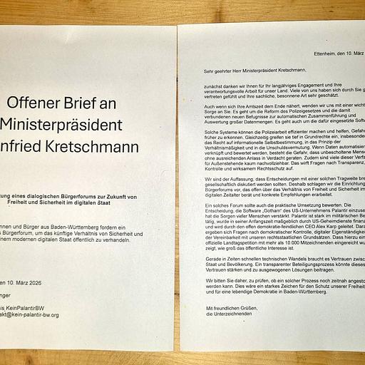 Der offene Brief, in dem wir ein Bürgerforum zur Umsetzung der Überwachung im neuen Polizeigesetz fordern, wurde am 13. März 2026 per Einschreiben an Ministerpräsident Winfried Kretschmann versandt.